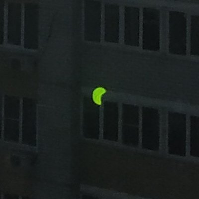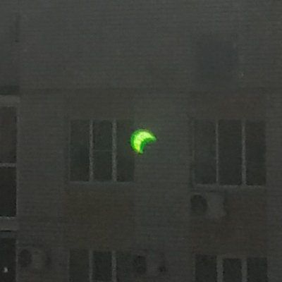Оказалось, совершенно не нужно никакого телескопа, фильтров, никаких стекол, закопченных на первобытном костре — ничего этого не надо. Достаточно обычного мобильника Сяоми в самом обычном режиме авто. Затмение на солнечном диске он, понятно, не сфоткает. Но... в силу загадочного устройства оптики у него есть солнечный блик — зелёненький такой, вы видите на фотке. Этот солнечный зайчик падает на произвольную часть кадра и идеально показывает прохождение луны по солнечному диску. Хотя, насколько я понимаю, в перевёрнутом виде. Вот в разные минуты затмения (начиная от пика и убывание):